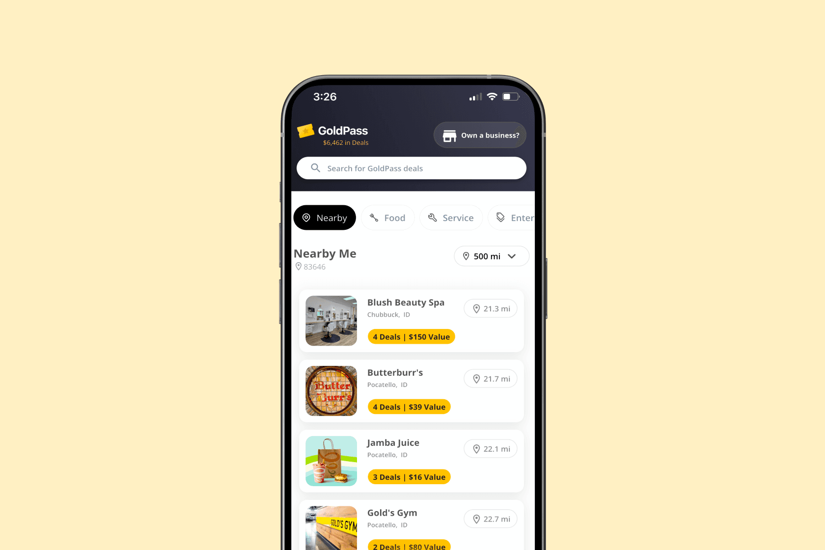The app makes it simple to browse deals by category, discover participating businesses nearby, redeem offers directly within the app, and track which GoldPass deals have already been used during the year.