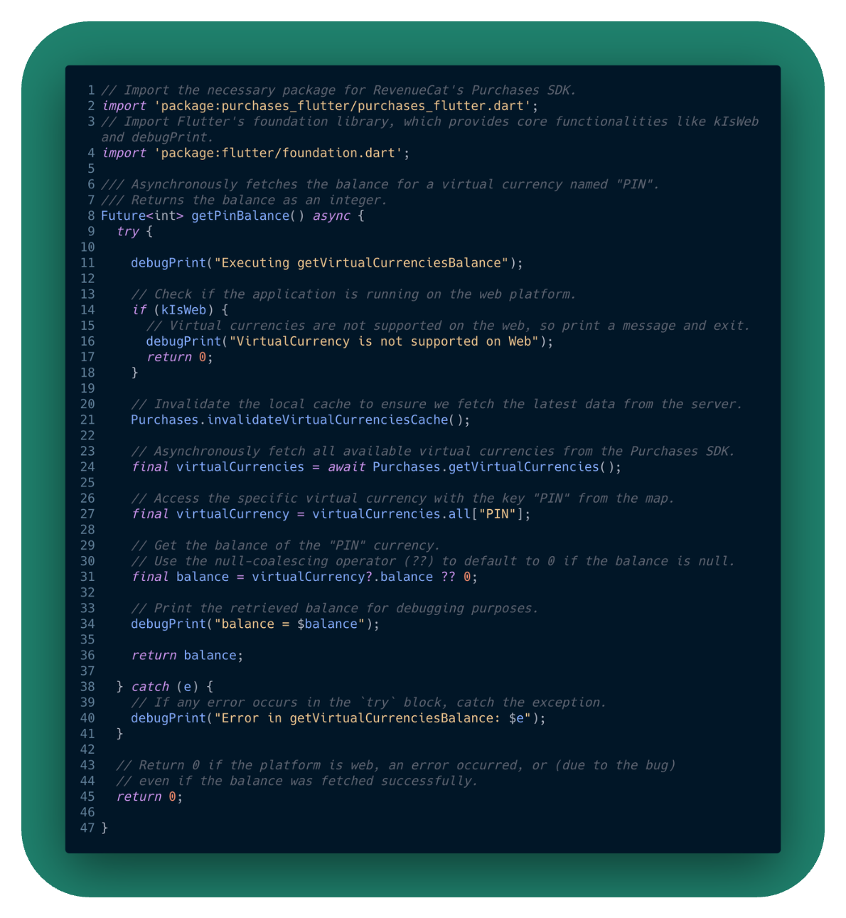 Dart code for a function that gets a user's "PIN" virtual currency balance from the RevenueCat SDK.