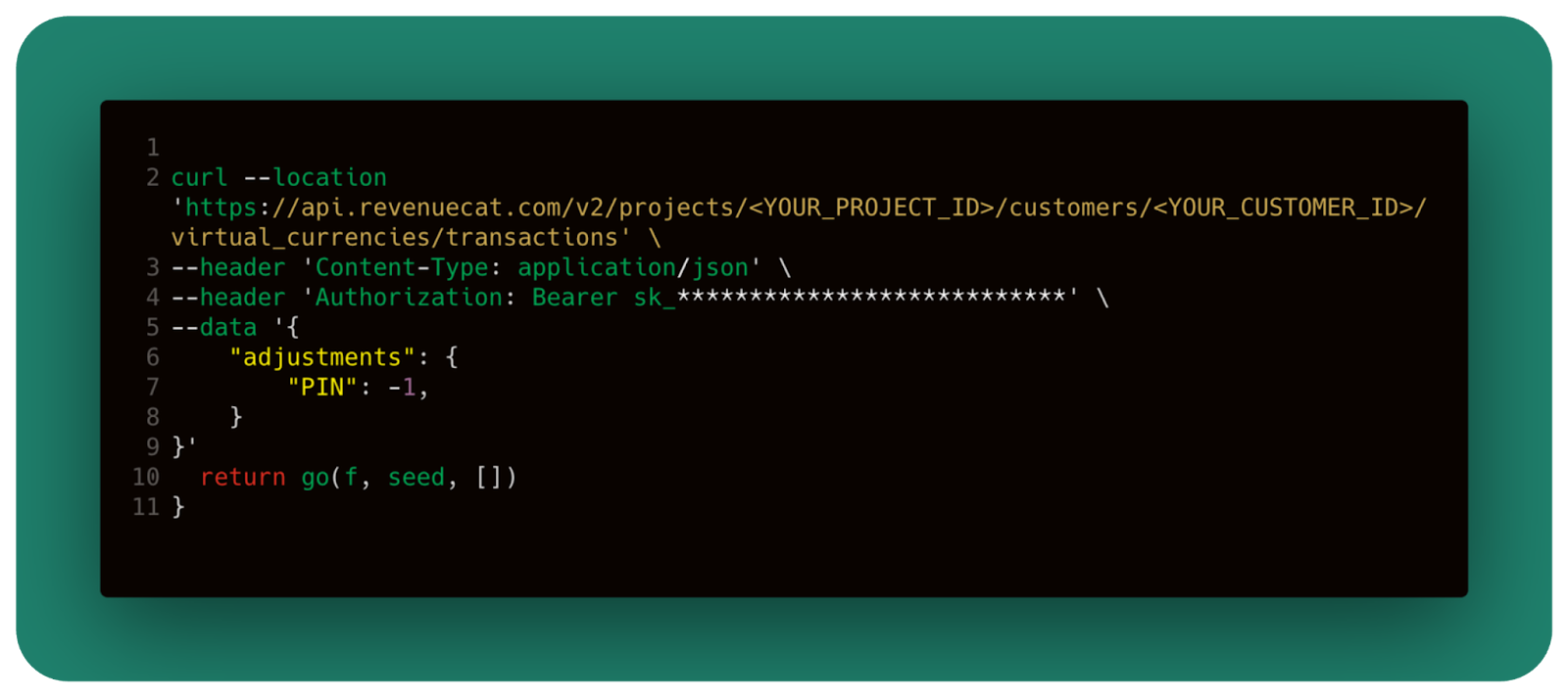 - Debit the Currency: Your backend must then call RevenueCat’s "spend" API to deduct the predefined amount of "PINs" from the user's balance.